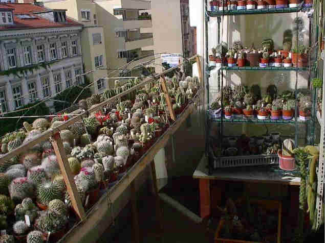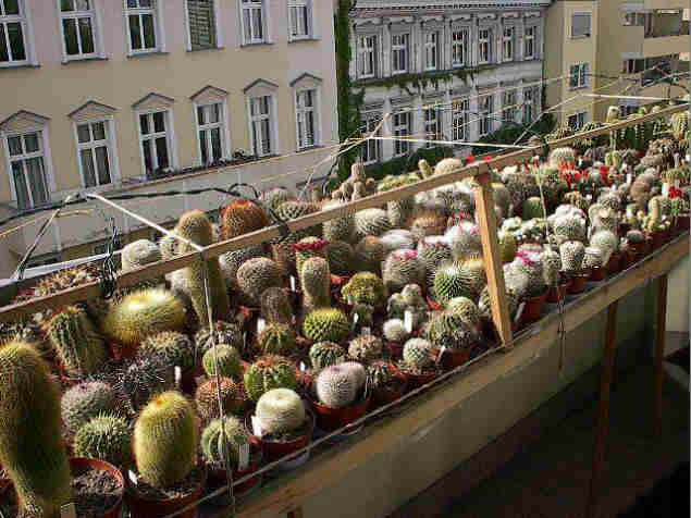 Der zweite Balkon hat erst ab 14.00 Uhr Sonne und dort stehen meine Kakteen. Meine Pflanzen stehen meistens von Ende März bis Anfang November im Freien. Empfindliche wärmeliebende Arten von Mai bis September. Es ist auch empfehlenswert die Pflanzen langsam an die Sonne zu gewöhnen (besonders wenn sie im Winter dunkel untergebracht sind ). Bei starker Sonneneinstrahlung können Verbrennungen entstehen, die man mit Abdeckung der Pflanzen mit Seidenpapier verhindern kann. |