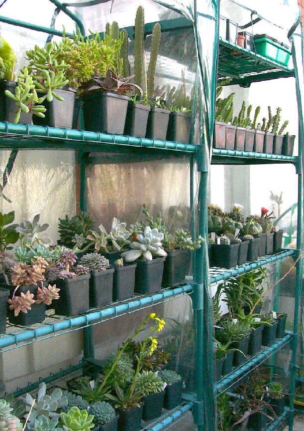Im Sommer stehen die Pflanzen auf dem Balkon. Ich habe zwei davon. Der Erste hat vormittags bis mittags Sonne und dort sind die anderen Sukkulenten untergebracht. Einen Teil meiner Pflanzen steht in Folienhäuser die sehr praktisch sind, der Rest auf der Balkonbrüstung und kann bei Bedarf mit Folie zugedeckt werden.