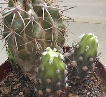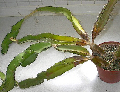 ![]() Vergeilen. Zu wenig Licht bei Wärme, und falsches Düngen läßt die Pflanzen blaß werden,im Neutrieb spitzig, hellgrün mit nur schwachen Dornen. Bei genügend Licht setzt wieder gesundes Wachstum ein. Betroffene Triebe bis ins gesunde Gewebe zurückschneiden |