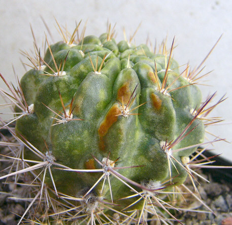![]() Verkorkung Bildung korkiger brauner Oberhaut, ähnlich der Schädigung durch Spinnmilben, bildet sich aber nur von unten her. Ist eine Eigenart oder oft Alterserscheinung bei einigen Atren so wie z.B. bei Notokakten. Bei guter Pflege wächst der Kaktus gesund weiter, so das die optisch unschöne Verkorkung nich überwiegt. |