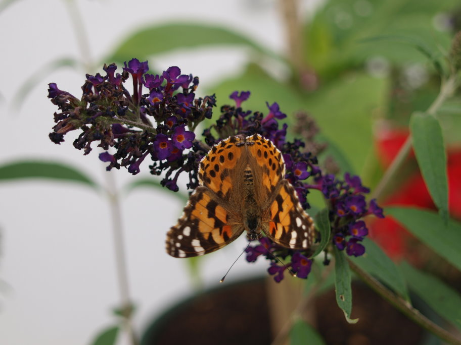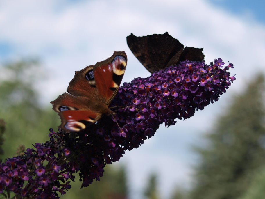 Neben der Terasse habe ich Sommerflieder und Lavendel gepflanzt. Das lockt viele Schmetterlinge an.